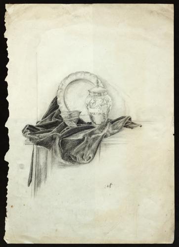 Centraal de hoek van een tafel. Op de tafel ligt een groot doek wat verfrommeld is, op het doek staat een pot. Achter de pot staat een schaal rechtop.