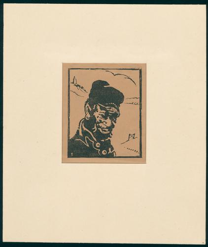 Portretkop van een oude man à trois quarts naar links. De man draagt een bolle pet en heeft een recht op staande kraag met ronde knopen. Op de achtergrond wordt een landschap gesuggereerd: l.b. een toren, r.o. een hek en bovenin vogels.