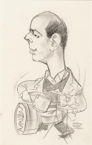 Maurits van Kleef achter een drumstel, ten voeten uit zittend en trois quart naar links, hoofd en profil naar links. Hij draagt de jodenster, op de bassdrum staat 'jazz'.