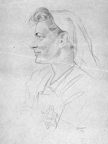 Verpleegster in uniform, schouderstuk en profil naar links. Ze draagt een jodenster.