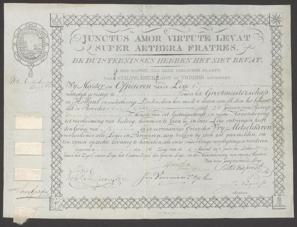 D015954: Getuigschrift van de vrijmetselarij dat Henry Godefroi de graad van meester heeft bereikt, 1814