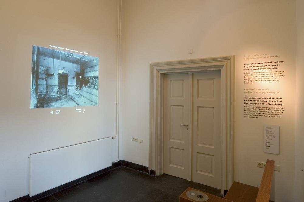 F900848: Voorportaal met virtuele reconstructie in de vernieuwde vaste opstelling "Religie" in de Grote Synagoge, 2004